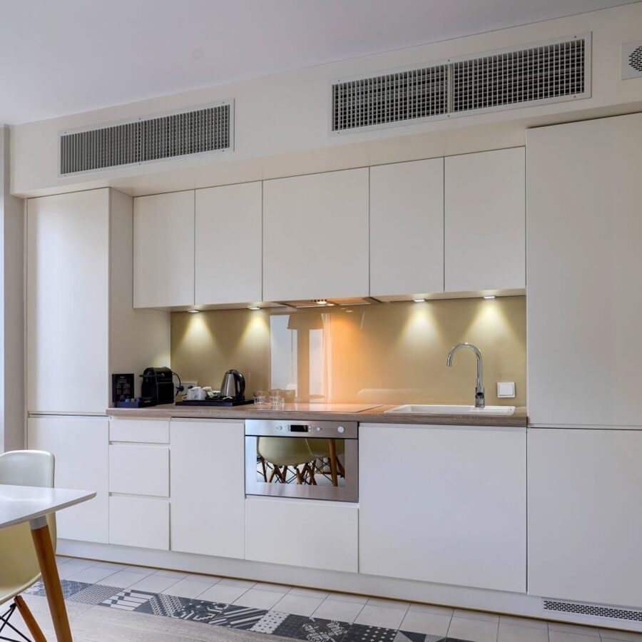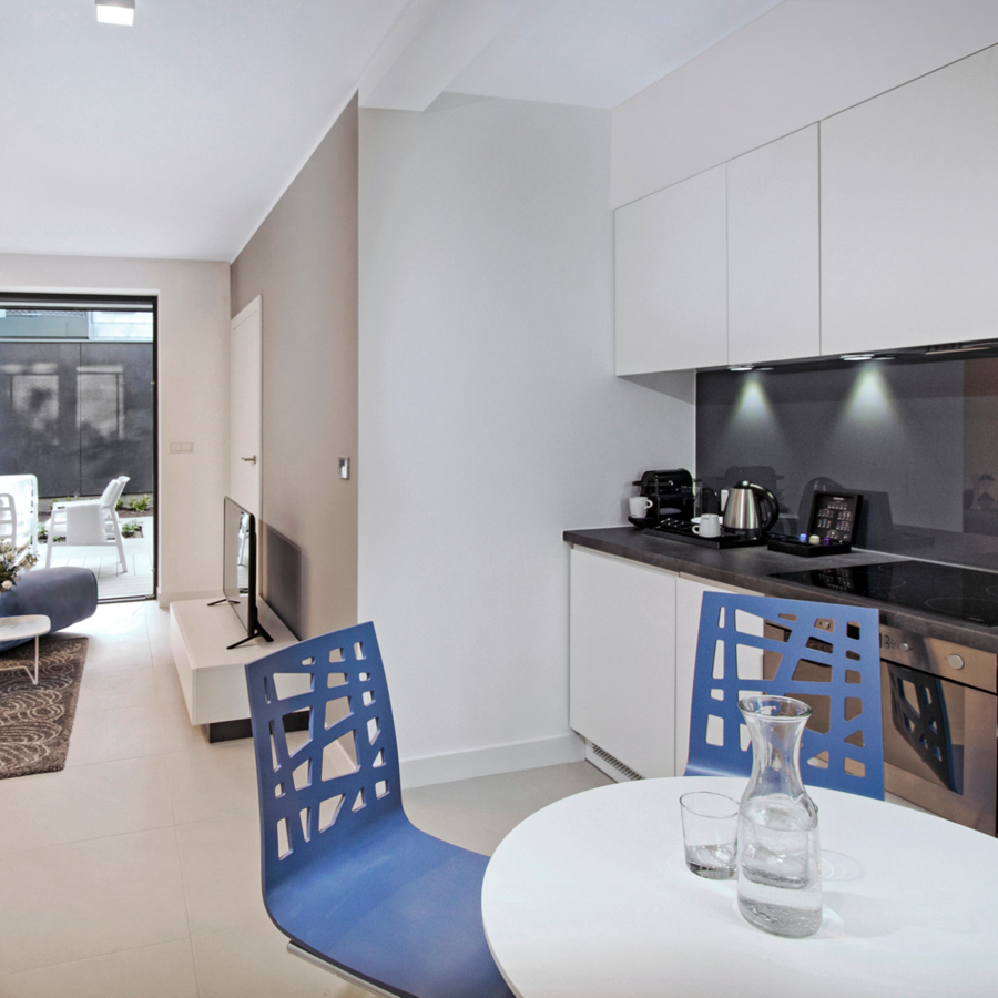 Moderní, klimatizované apartmány jsme zařídili tak, aby se naši hosté cítili jako ve svém druhém domově. V každém se nachází obývací pokoj, minimálně jedna ložnice a komplexně vybavený kuchyňský kout, ve kterém si můžete připravit aromatickou kávu, abyste si ji vychutnali na balkóně nebo terase s výhledem do zahrady.