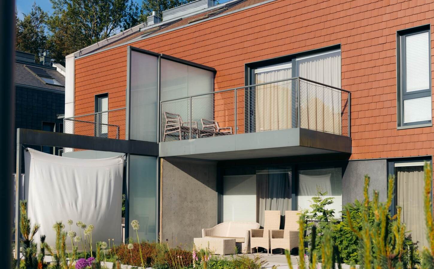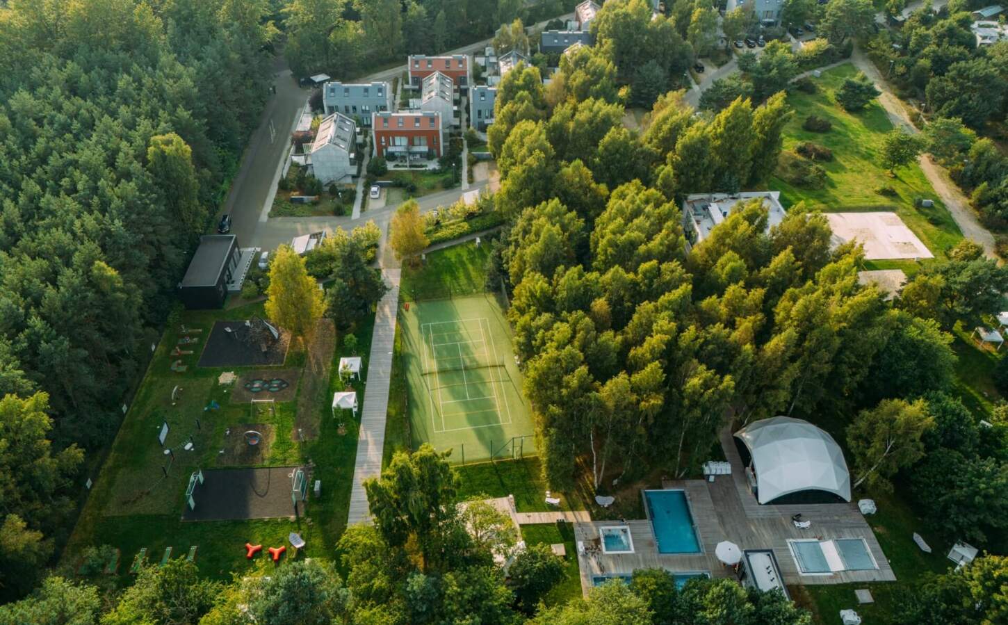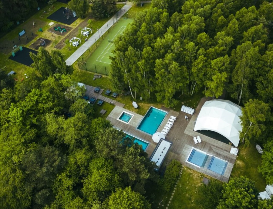Das Resort erstreckt sich über eine Fläche von 7 Hektar und wurde mit Respekt vor der Natur entworfen. Die minimalistische Architektur fügt sich perfekt in den umliegenden Wald und den wunderschönen Garten ein.